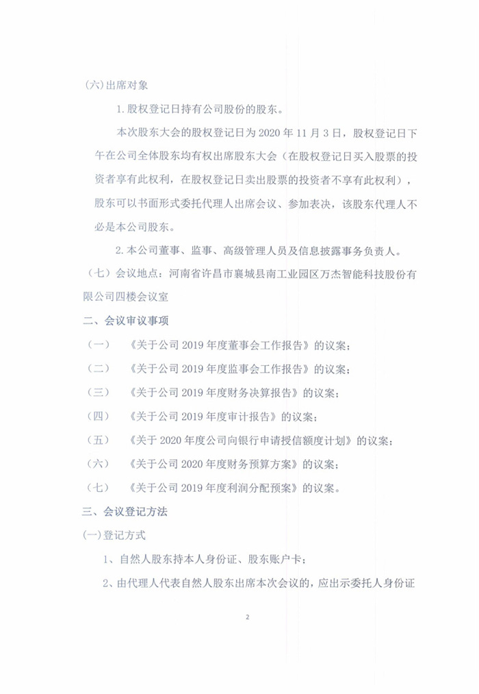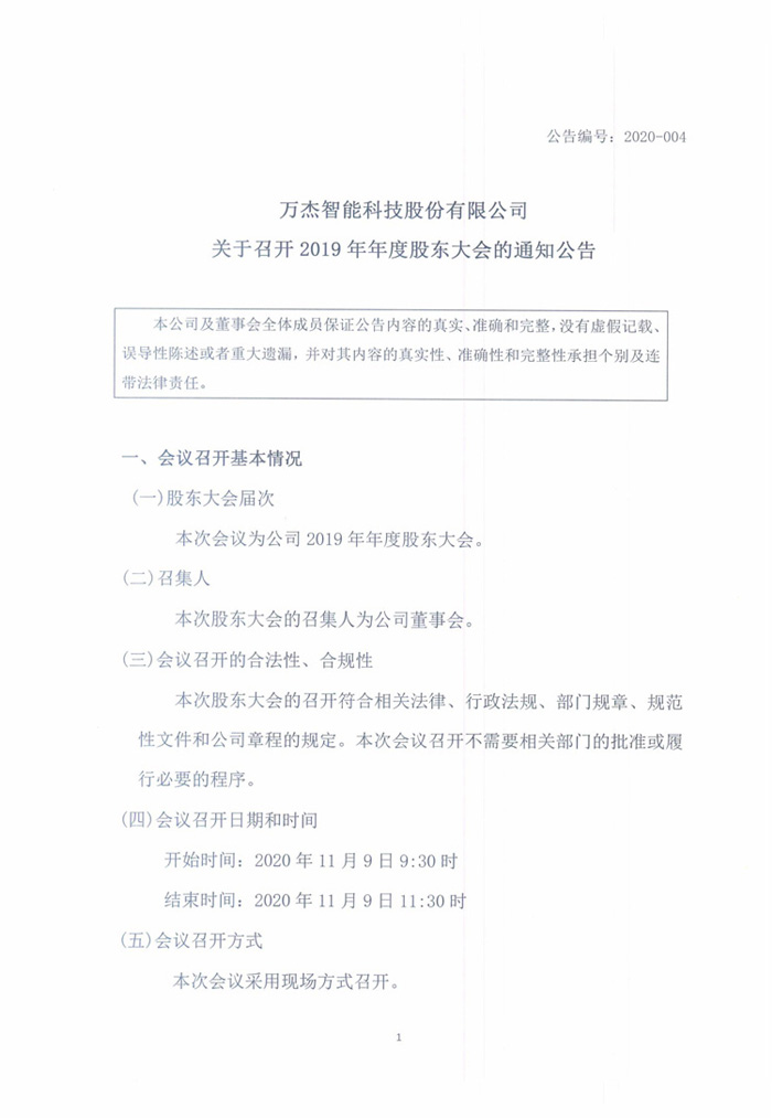 當前位置: 首頁 新聞資訊 公司動態 萬杰智能關于召開2019年年度股東大會的通知公告