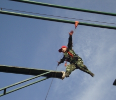 高空斷橋:在距離地面8米的高空搭起了一座獨(dú)木橋,而這個(gè)橋的中間卻是斷開的,間距1.2米-1.4米,要求每個(gè)隊(duì)員爬上8米的高空后,在空中躍起,從橋的這側(cè)跳到另一側(cè), 雖然身上掛滿了安全保護(hù)措施,但在高空跳躍,每個(gè)人都產(chǎn)生了或多或少的恐懼感,從爬上去站到高空已是一次極大的考驗(yàn),從高空躍到對(duì)面更是一次心理的挑戰(zhàn)。有的同伴從滿臉通紅到面色蒼白,有的戰(zhàn)戰(zhàn)兢兢不敢站立,有的站了許久不敢躍起,還有的上去之后直叫:“我有恐高癥!是真的……”在隊(duì)長(zhǎng)的帶領(lǐng)下,我們?yōu)槊恳粋(gè)參訓(xùn)的隊(duì)員“加油”,目送他們一個(gè)一個(gè)爬上搖搖晃晃的高桿,然后不斷呼喊他們的名字,每完成一個(gè)步驟都熱烈地鼓掌高呼。結(jié)果,全隊(duì)20多名隊(duì)員都順利完成了這項(xiàng)訓(xùn)練,zui后大家用熱烈的掌聲慶賀自己的成功和勝利。 此項(xiàng)目心得體會(huì):表面看起來(lái)很難的事,其實(shí)并沒(méi)有想象中那么可怕。在工作、生活中,遇到困難并不可怕,怕的是失去解決困難的勇氣和信心!心理的障礙是zui難逾越的,我們?nèi)绻蔀閺?qiáng)者,首先就必須挑戰(zhàn)自己的恐懼感,當(dāng)我們豁出去一搏,勇敢地跨出一小步,也許就能抓住屬于自己的機(jī)會(huì),實(shí)現(xiàn)人生一大步的跨越。